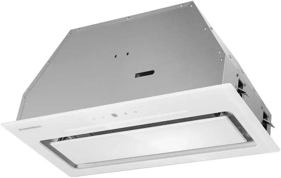 конструкция скрытая, монтаж для встраивания, ширина 59.8 см, управление сенсорное/дистанционное, производительность мотора 1150 м?/ч, цвет белый